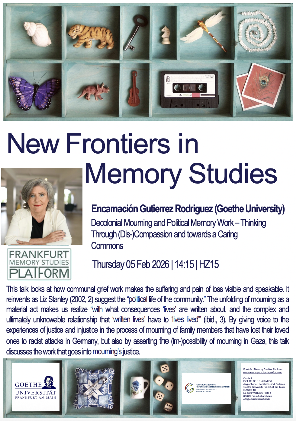 This talk looks at how communal grief work makes the suffering and pain of loss visible and speakable. It reinvents as Liz Stanley (2002, 2) suggests the “political life of the community.” The unfolding of mourning as a material act makes us realize “with what consequences ‘lives’ are written about, and the complex and ultimately unknowable relationship that ‘written lives’ have to ‘lives lived’” (ibid., 3). By giving voice to the experiences of justice and injustice in the process of mourning of family members that have lost their loved ones to racist attacks in Germany, but also by asserting the (im-)possibility of mourning in Gaza, this talk discusses the work that goes into mourning’s justice.