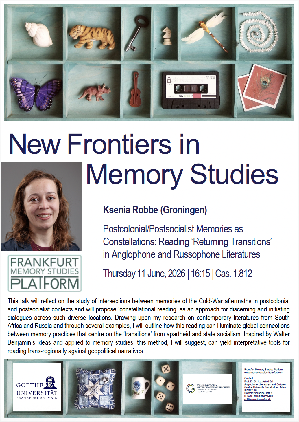 This talk will reflect on the study of intersections between memories of the Cold-War aftermaths in postcolonial and postsocialist contexts and will propose ‘constellational reading’ as an approach for discerning and initiating dialogues across such diverse locations. Drawing upon my research on contemporary literatures from South Africa and Russia and through several examples, I will outline how this reading can illuminate global connections between memory practices that centre on the ‘transitions’ from apartheid and state socialism. Inspired by Walter Benjamin’s ideas and applied to memory studies, this method, I will suggest, can yield interpretative tools for reading trans-regionally against geopolitical narratives.